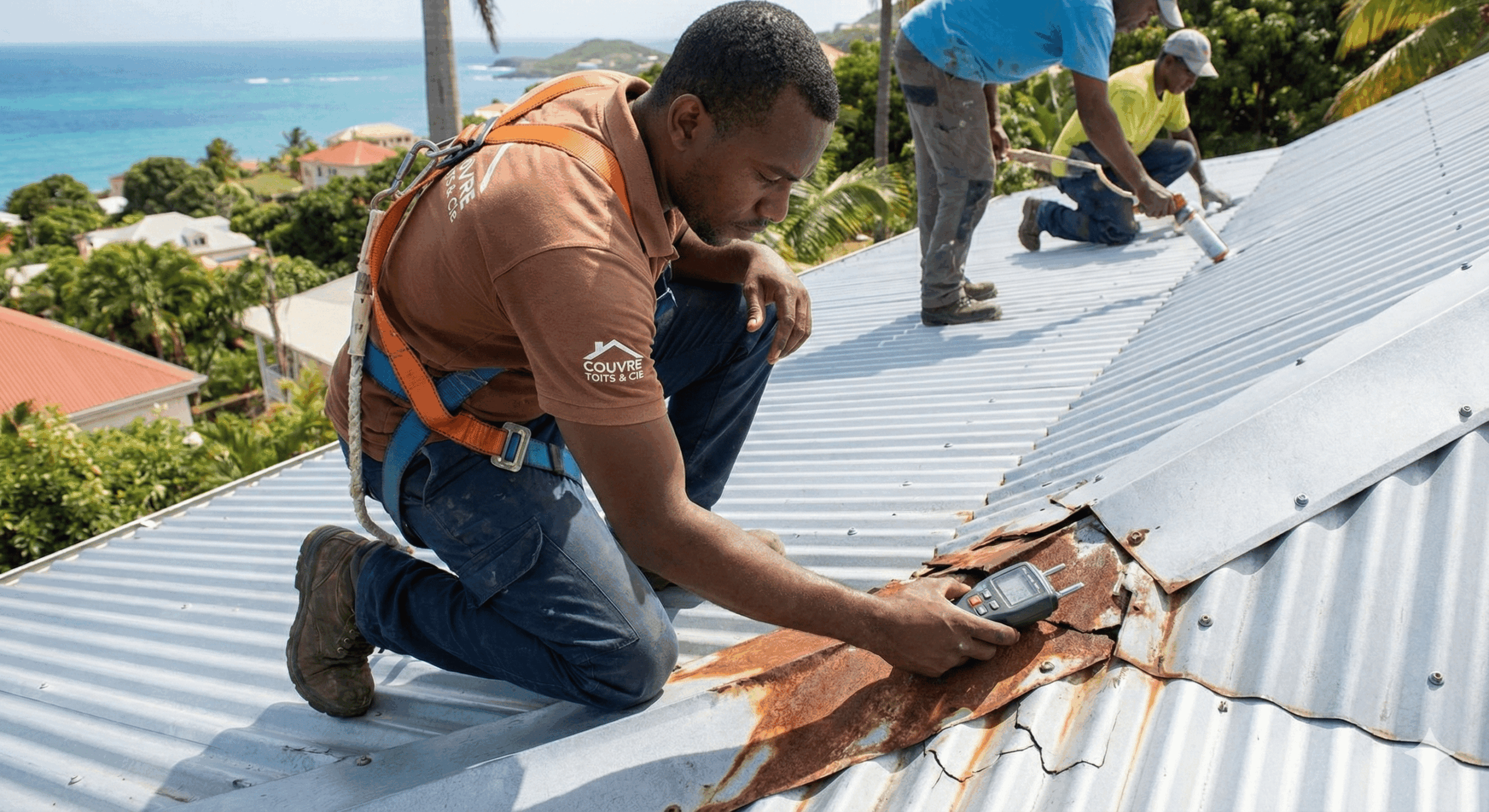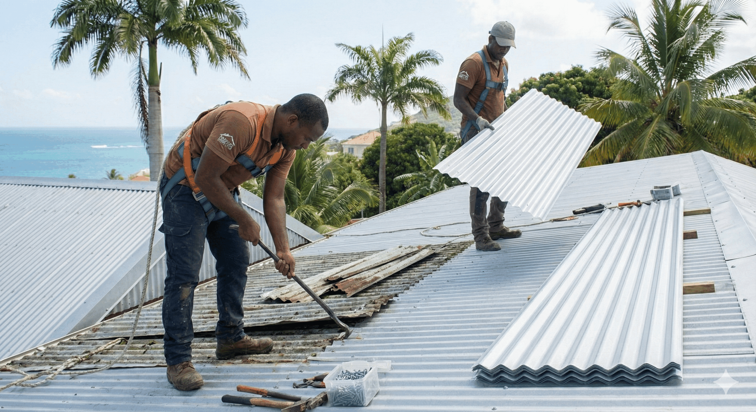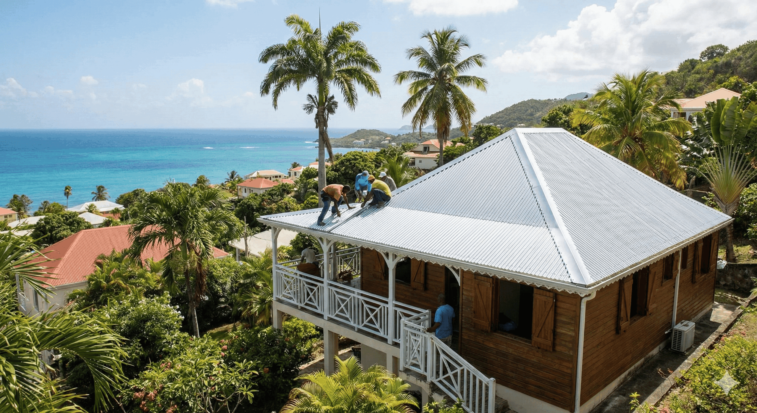 Couvre Toits & Cie, c’est une équipe de professionnels certifiés, spécialisés dans la protection et la durabilité de votre toiture en Martinique. Nous intervenons sur tous types de couvertures : tôle, tuile, toiture-terrasse et charpente, avec un savoir-faire reconnu et des méthodes éprouvées pour répondre à vos besoins. Notre priorité ? Votre satisfaction, en vous accompagnant de l’étude de votre projet à sa réalisation, dans le respect de votre budget et de vos attentes.